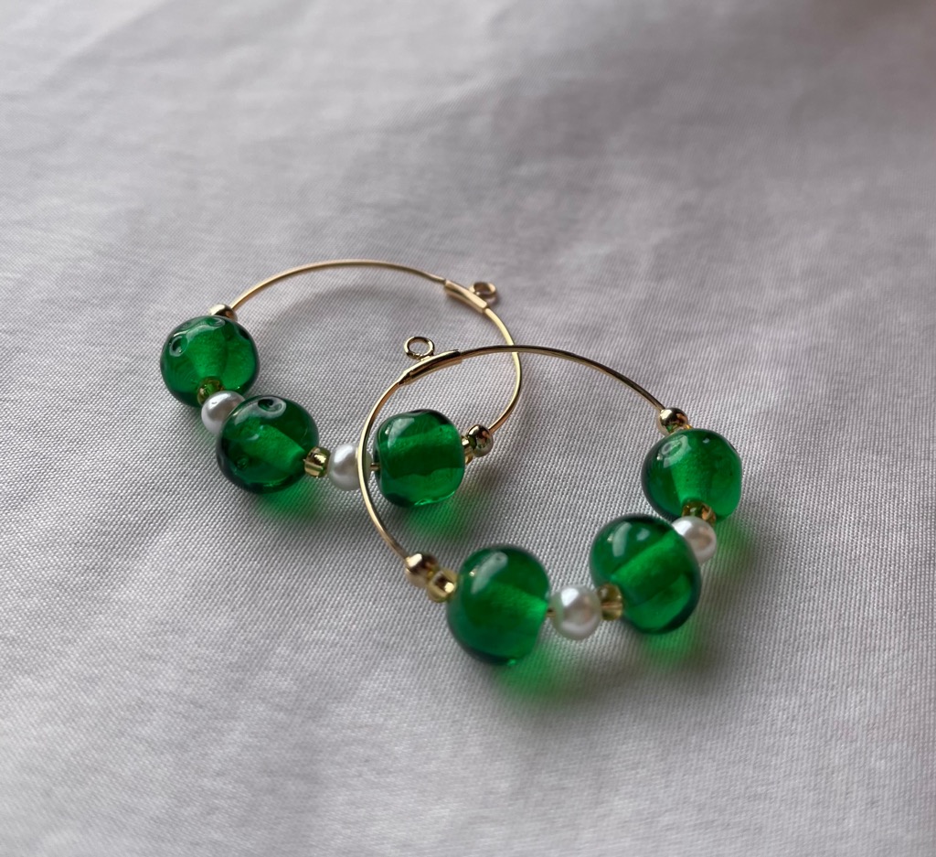 使用しているパーツは ・アクリル製パール ・ジャパンヴィンテージのガラスビーズ(緑)です。 ガラスビーズはよく見ると凹凸があり一つ一つ個性のあるパーツを使用しております! 本日からSTORESで販売しております♪ 一点ものですので欲しい方はお早めにどうぞ!!