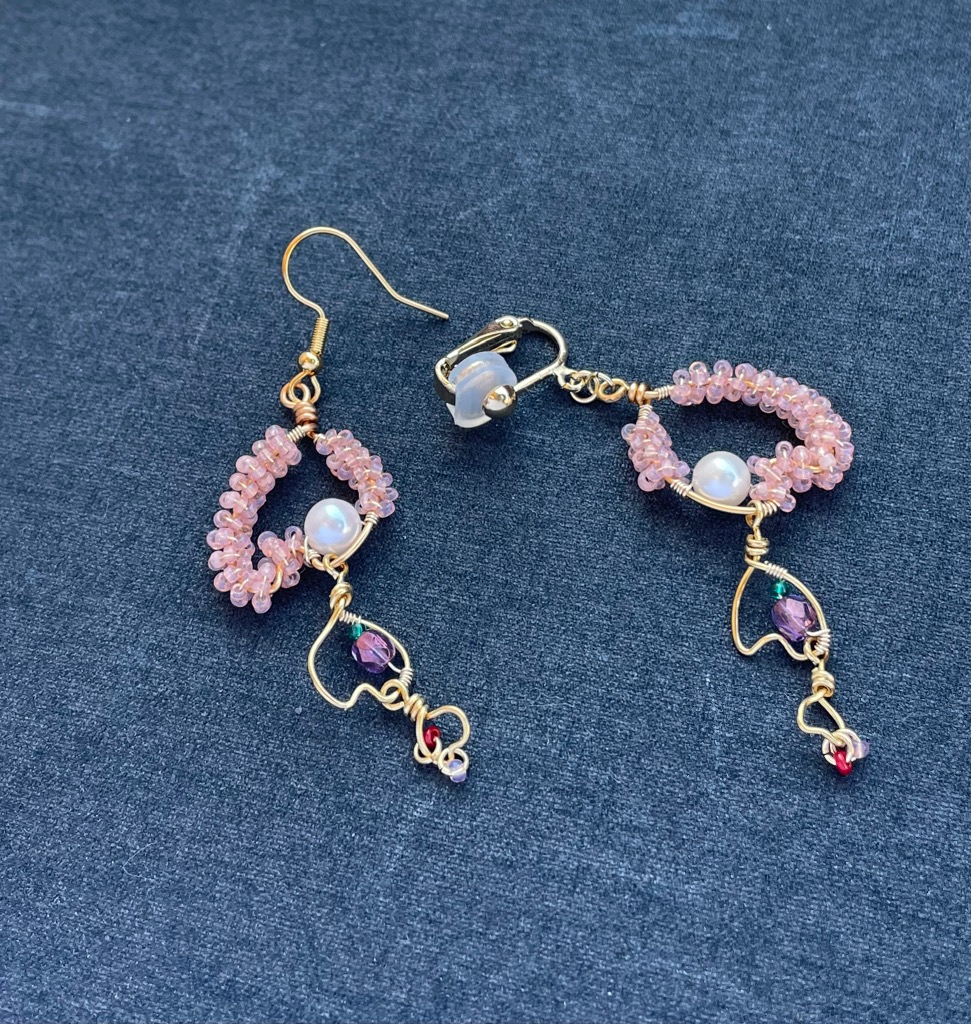 桜をイメージした作品です! ワイヤーも一から作成した一点物の作品になっております! 使用しているヴィンテージビーズは一つ一つ形が違くヴィンテージならではの風合いになっております! つけた時の揺れ感が可愛い!!詳しくはインスタまで。