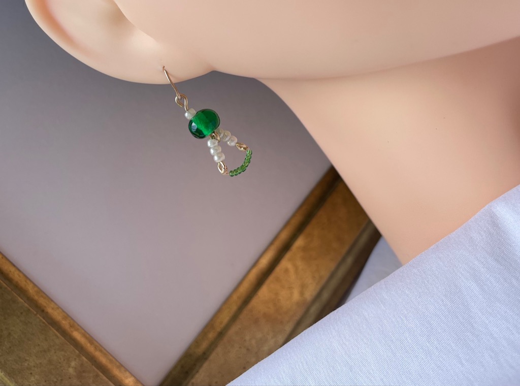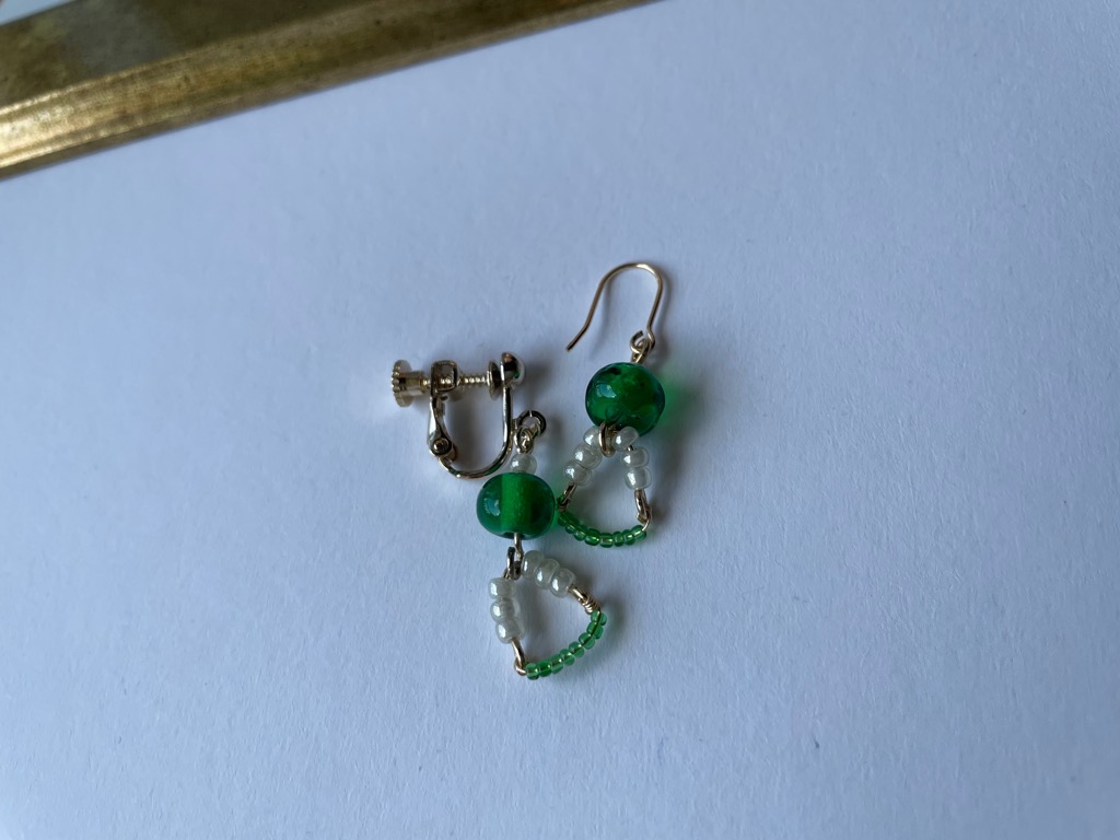 グリーン好きにはたまらない作品をご紹介します! 上から順に白のガラスビーズ(フランス) 少し大きいガラスビーズ(ジャパンヴィンテージ) 極小のガラスビーズ(フランス)を使用した作品です。全てヴィンテージパーツを使用しております! 小ぶりですのでちょっとしたお出かけからジーンズなどのラフな格好とご一緒にいかがでしょう! そしてタイトルでご紹介したグリーンがお好きな方! 一点物ですので気になる方はお早めに! こちらまで←