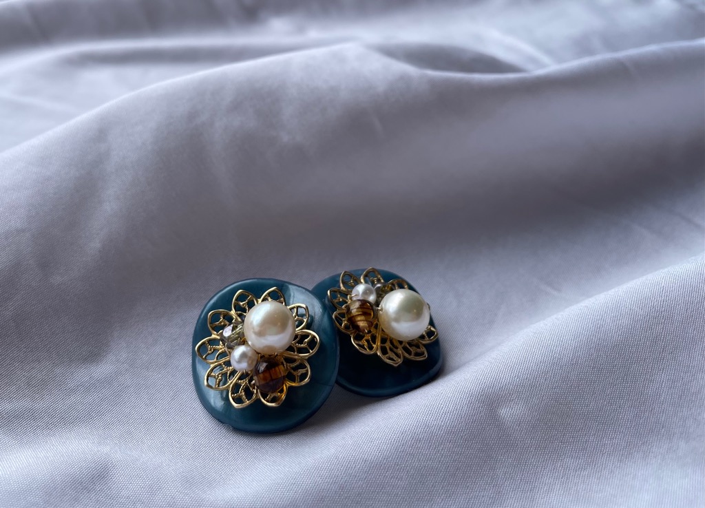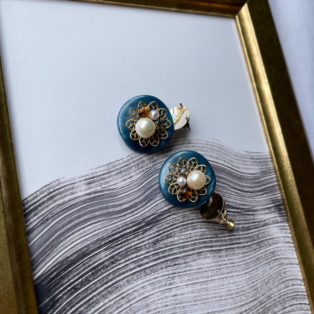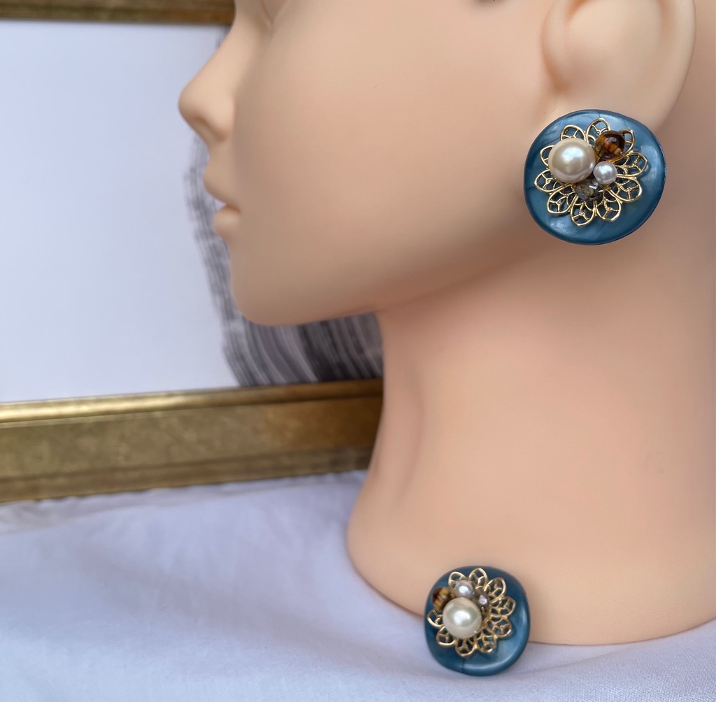 直接2.5cmのアクリルビーズの上に金具、ガラスパール,べっこう、アクリルパール,モスグリーンのガラスビーズを乗せてみました! パーツは全てヴィンテージとなってます。 お店では販売していないハンドメイドアクセサリーならではのデザインになっております。こちらは一点物です!気になる方はお早めに→こちらまで!